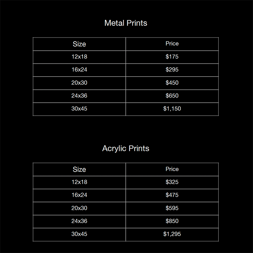 These costs represent introductory pricing. Customers purchasing two or more prints will receive a 15% discount. Please contact for larger prints, custom sizing or any questions.